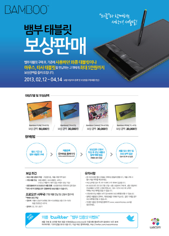 무선 기능을 지원하는 뱀부 태블릿은 남녀노소 누구나 손쉽게 쓸 수 있는 보급형 펜 태블릿으로 손글씨, 메모, 드로잉, 스케칭, 게임, 사진 편집 등 다양한 디지털 콘텐츠를 만드는 데 최적이다. 뱀부 코믹은 오픈캔버스, 코렐 페인터 소프트웨어가 기본 번들로 제공돼 만화, 유화 등에 특화된 다양한 색채감과 질감, 세밀한 터칭을 가능하게 해준다. 성상희 한국와콤 부장은 "이번 프로모션은 펜 태블릿이 오래돼 신규 교체가 필요한 사용자들이 부담 없이 태블릿을 업그레이드 할 수 있는 좋은 기회가 될 것"이라고 말했다.