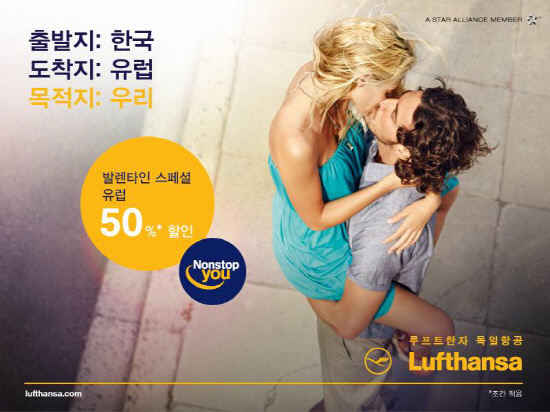 루프트한자 독일항공(크리스토퍼 짐머 한국 지사장)이 발렌타인 데이를 맞아 유럽 항공권을 50%에 할인해 주는 특가 행사를 진행한다. 이같은 기회는 1년에 단 한번 뿐이기 때문에 올 봄 혹은 이른 여름 유럽 여행을 생각하고 있다면 좋은 기회가 될 수 있을 것으로 보인다. 루프트한자에 따르면 2월 13일부터 20일까지 8일 동안 두 명이 각각 50% 할인된 가격으로 예약, 즉 한 명 가격으로 항공권 2매를 구입할 수 있다. 여행 일정은 2013년 4월 1일부터 6월 30일까지 출발 가능하며 귀국은 4월 7일부터 7월 31일까지만 하면 된다. 단 두 명이 같은 여정에 동시 구매만 가능하며, 취소할 경우 티켓 모두를 취소해야 한다. 본 특가 항공권은 루프트한자 홈페이지(lufthansa.com)나 모바일(mobile.lufthansa.com)에서만 예약이 가능하다.