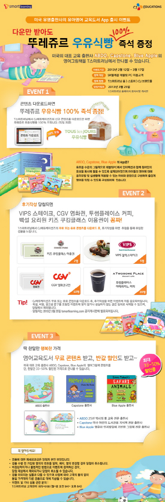 CJ에듀케이션즈는 이벤트 기간 동안 앱을 33%에서 최대 50%까지 할인 판매할 예정이다. 앱을 다운받은 모든 고객들에게 뚜레쥬르 우유식빵 기프티콘을 선물로 준다. 또한 영어 도서 콘텐츠 3종도 특별히 무료로 제공한다. 해당 콘텐츠는 앱도(ABDO)사의 지식그림책 시리즈 중 요일과 달의 의미와 순서를 배우는 '먼데이(Monday)', '재뉴어리(January)', 도형에 대해 배우는 '써클즈(Circles)'다.