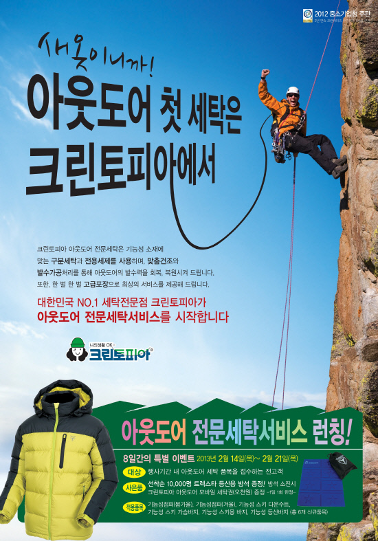 세탁 프랜차이즈 크린토피아(www.cleantopia.com)가 14일부터 2월 21일까지 8일간 '크린토피아아웃도어 전문세탁 서비스 런칭' 행사를 진행한다.