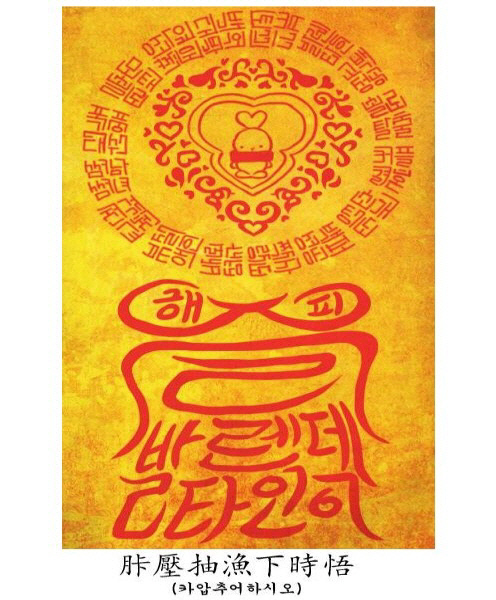 부적에는 '해피즐발렌타인', '솔로탈출 커플결혼 소개팅도 백퍼성공 부실애인 전격교체' 등이 교묘하게 적힌 가운데 캐릭터 부토가 자리하고 있다. 부적 하단에는 '?壓抽漁下時悟(카압추어하시오)'라는 한자성어 표기와 함께 전달하지 않으면 소개팅마다 진상을 만날 것이라는 멘트로 캡쳐와 전달을 강요하고 있어 웃음을 자아낸다.