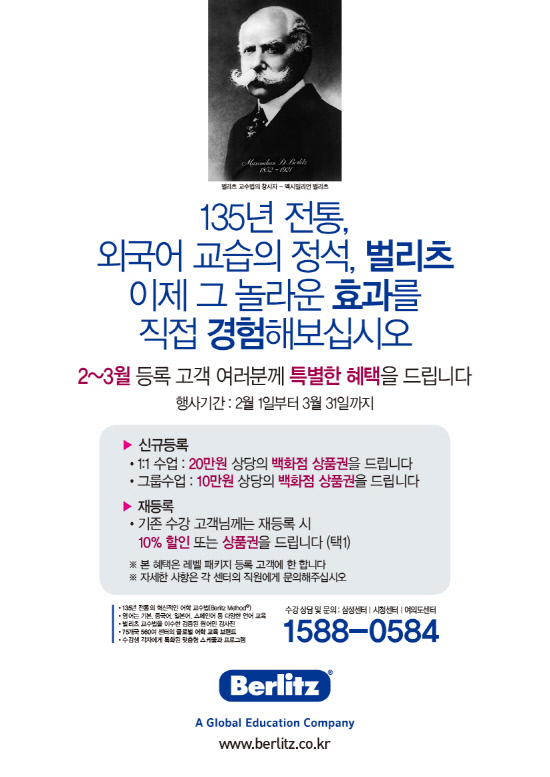 135년 전통 벌리츠가 2월과 3월 두 달 동안 수업을 등록하는 고객을 대상으로 백화점 상품권 및 할인혜택을 제공하는 벌리츠 스프링 캠페인(Berlitz Spring Campaign)을 실시한다.