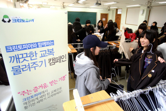 세탁 프랜차이즈 크린토피아(www.cleantopia.com)가 지난 2일까지 새 학기를 맞아 학부모들의 교복 가격 부담을 줄이고, 자원 절약을 위해 전국 중고등학교를 대상으로 '깨끗한 교복 물려주기 캠페인'과 함께 교복 무료세탁을 진행 했다.