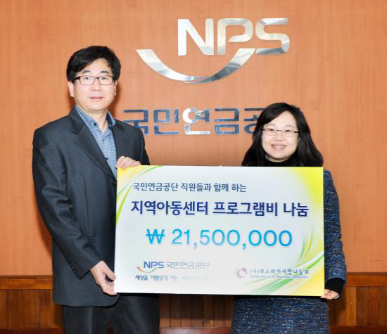 국민연금공단(이사장 전광우)은 15일 사회복지법인인 '부스러기사랑나눔회'와 저소득층을 대상으로 지역아동센터에 방과후 학습프로그램을 후원하기로 하고 전달식을 가졌다.