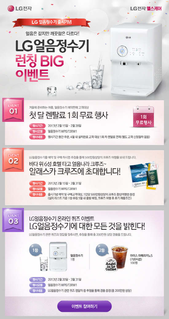 LG전자가 'LG얼음정수기' 출시를 기념해 3월 31일까지 3가지의 통 큰 이벤트를 실시한다.