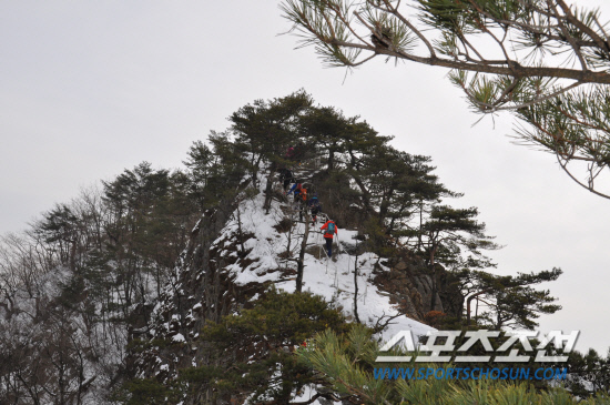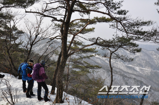 정상을 오르다 문득 뒤를 쳐다봤다. 바위 틈에 뿌리를 내리고 꽂꽂이 서 있는 소나무 뒤로 눈 덮인 산 그리메가 물결친다. 강원도는 역시 산 천지다. 백치고개쪽으로 잡은 하산길은 사람들이 별로 찾지 않아 뽀송뽀송한 신설이다. 아이젠도 소용없다. 그냥 눈 위에 몸을 맡기니 눈썰매장이 저리가라다.