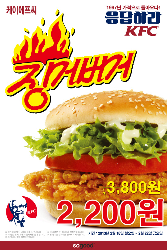 KFC(http://www.kfckorea.com)는 18일부터 오는 22일까지 징거버거를 16년 전 가격에 판매한다.