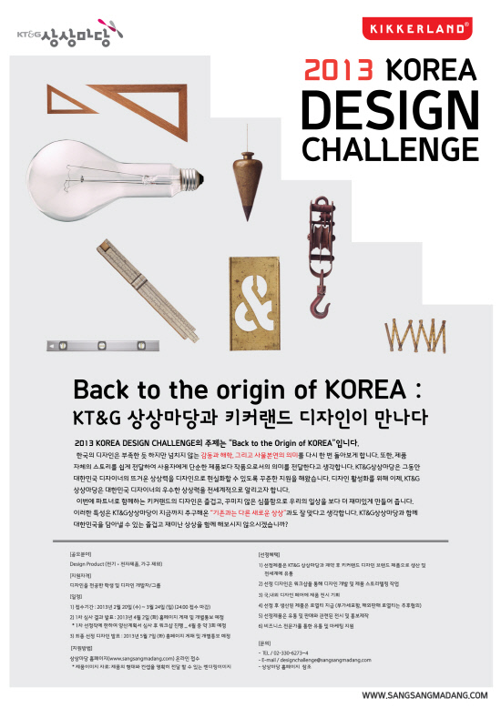 '코리아 디자인 챌린지'는 KT&G가 상상마당을 통해 올해 처음 마련한 디자인 지원 프로그램으로, 미국 디자인 유통 회사인 키커랜드(Kikkerland)와 공동 개최해 제품 상용화와 해외 유통까지 협업하여 진행할 계획이다.