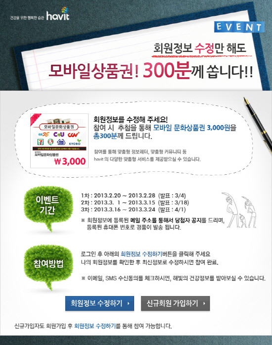 '건강을 위한 행복한 습관'을 제공하는 헬스케어 포털사이트 해빛(www.havitcare.com)이 개인정보를 업데이트한 기존 회원과 신규 가입 회원을 대상으로 모바일문화상품권을 증정하는 '개인정보 업데이트 이벤트'를 2월 20일부터 3월 31일까지 실시한다고 밝혔다.