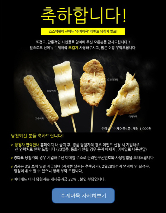 이 같은 뜨거운 이벤트 인기에 힘입어 죠스떡볶이 측은 고객들을 위해 원래 예정된 경품은 물론, 100명의 고객을 추가 선정해 삼진식품이 운영중인 온라인 어묵 쇼핑몰 '어묵 1번가'에서 사용할 수 있는 무료 쿠폰(5천원 상당)을 증정한다.
