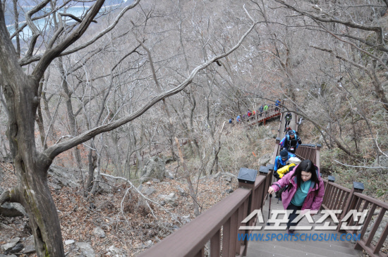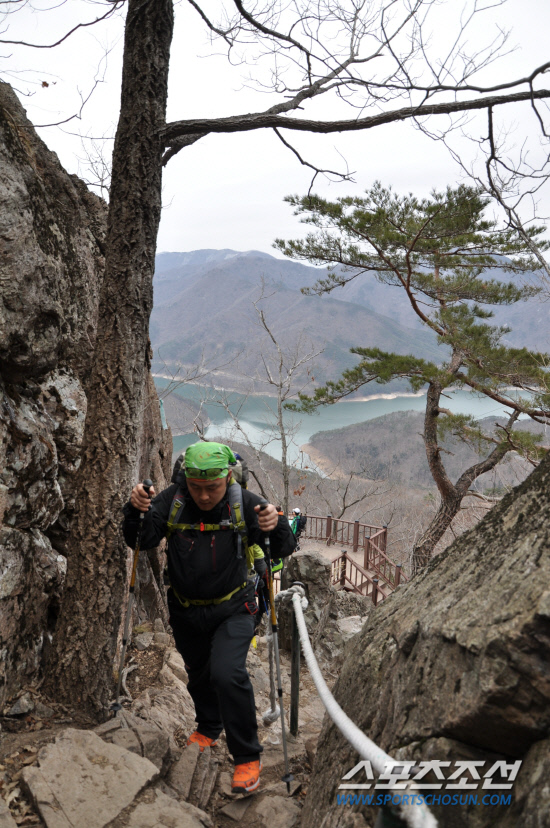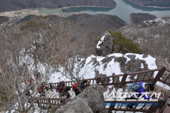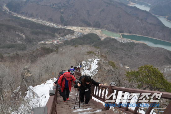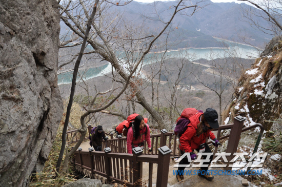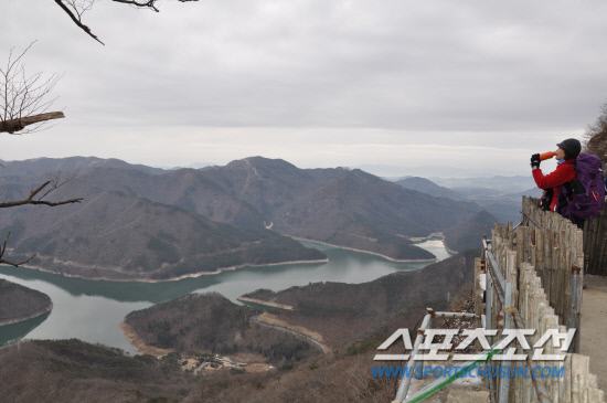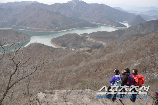 곧바로 끝도 모를 나무 계단이 시작된다. 숨소리가 거칠어지고 있을 찰나, 갑자기 앞서가던 참가자들의 입에서 탄성이 터져 나온다. 마치 파노라마처럼 담양호가 눈 앞에 펼쳐진다. 겨우내 숨을 죽였을 담양호는 어느새 겨울 흔적을 지우고 코발트빛을 뽐내고 있다. 주명진씨는 "캐나다 록키 산맥을 산행하다 마주쳤던 그림같은 호수 풍경과 비슷하다"며 자리를 뜰 줄 모른다. 회색빛 하늘이 아쉬울 뿐이다.