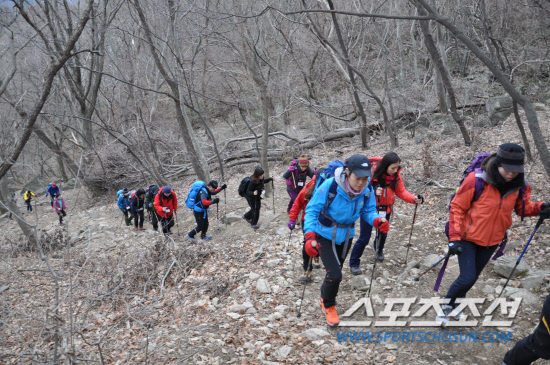 소나무 숲을 지나자 바로 돌투성이의 오르막길이 시작된다. 사실 늦겨울의 산은 큰 재미가 없다. 심설 산행도 끝자락인데다, 아직 봄 기운도 느낄 수 없이 삭막하다. 군데군데 자리잡은 산죽이 더 푸르러 보였던 이유다.