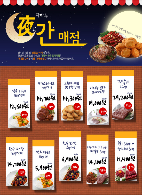 다하누몰(대표 최계경)이 겨울밤 야식으로 탁월한 다하누의 알짜배기 먹거리 상품을 파격 특가에 판매하는 '다하누몰, 야간매점' 기획전을 준비했다.