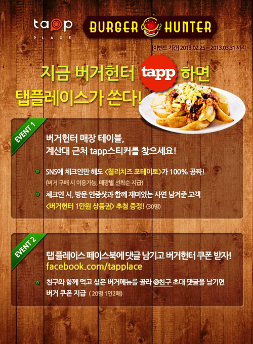 탭 플레이스는 오는 3월 31일까지 서울/경기에 위치한 버거헌터 매장을 방문해 체크인하고, SNS에 방문 기록을 남겨준 고객 전원에게 선착순으로 '칠리치즈포테이토' 쿠폰을 100% 무료 증정한다. 매장테이블, 계산대 위 tapp(탭) 로고를 찾아 스마트폰으로 접촉하면 자동으로 체크인 화면이 나타나며 재미있는 사연과 함께 방문 인증샷을 남겨준고객에게는 추첨을 통해 버거헌터 1만원 상품권을 추가 지급할 예정이다.