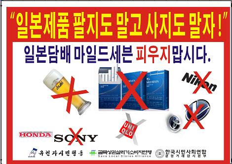 불매운동 대상 제품은 '마일드세븐', '아사히 맥주', '니콘', '유니클로', '토요타', '소니' 등이다.