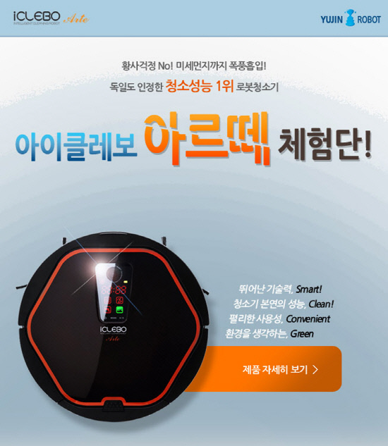 이호진 유진로봇 이사는 "아이클레보 아르떼 무료 소비자 체험단 이벤트는 그간 높은 관심과 성원을 보내준 소비자들의 생생한 의견을 청취하기 위해 마련했다"며 "독일 및 유럽 등 세계 시장에서 인정받은 '아이클레보 아르떼'의 높은 기술력을 체험하는 기회를 지속적으로 마련해 국내 소비자들과의 접점을 넓혀 갈 계획"이라고 말했다.
