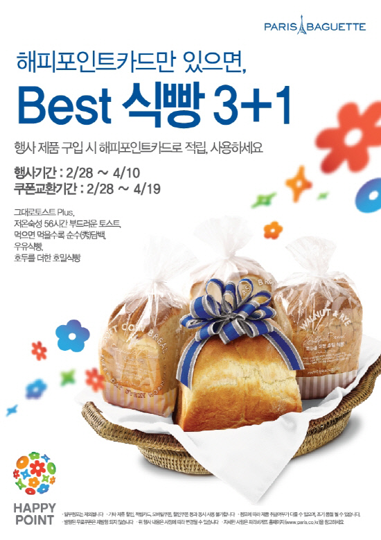 이러한 소비패턴을 반영하여 ㈜파리크라상(국가고객만족도 1위, 대표이사 최석원)의 대표브랜드 파리바게뜨가 해피포인트 고객을 대상으로 식빵 이벤트를 진행한다.