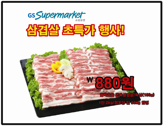 GS수퍼마켓은 삼겹살 초특가 판매를 하는 기간 동안 삼겹살 외에도 돼지갈비와 앞다리살을 580원에 판매하는 등 다양한 부위의 돼지고기를 사상 최저 가격으로 판매한다.
