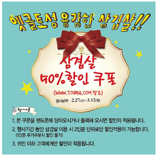 옛골토성이 3월 3일 삼겹살데이를 맞아 '삼겹살 바베큐 파격 할인' 행사를 벌인다. 27일 수요일부터 3월 12일 화요일까지 2주간 진행될 계획. 옛골토성 홈페이지(www.tobaq.com)에서 쿠폰을 출력하거나 옛골토성 SNS(트위터, 페이스북, 카페)에서 받을 수 있다. 출력 뿐만 아니라 휴대폰에 사진으로 담아와도 할인이 가능하다.