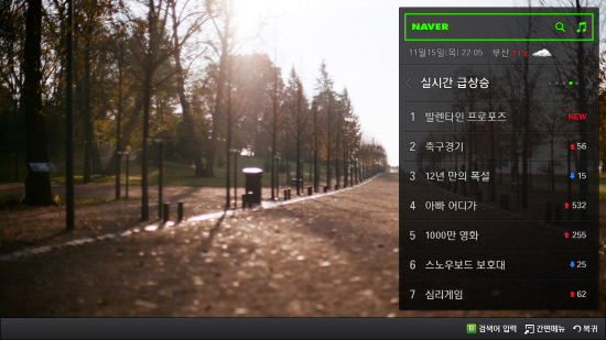 삼성 스마트TV를 통해 제공되는 '네이버앱'은 이용자들이 TV 시청에 방해를 받지 않고 앱을 통해 다양한 정보를 확인할 수 있다는 것이 큰 특징. 기존 스마트TV에서 앱을 실행시키면 방송화면에서 앱 실행화면으로 전환되거나, 화면이 분할되는 등 방송을 보면서 동시에 활용하기가 쉽지 않았다. '네이버앱'은 방송화면을 그대로 두고 화면 맨 우측 영역에 반투명 형태로 노출돼, 이용자들은 TV 시청에 불편함없이 앱을 이용할 수 있다.