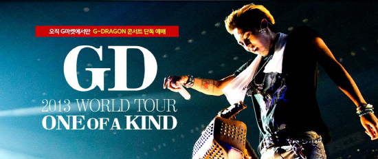 3월 5일과 6일 오후 8시부터 지마켓 홈페이지를 통해 티켓 예매가 진행된다. 이번 '지드래곤 2013 월드투어-원 오브 어 카인드'는 오는 3월 30일(오후 6시)과 31일(오후 3시) 이틀 간 올림픽공원 체조경기장에서 열릴 예정이다.