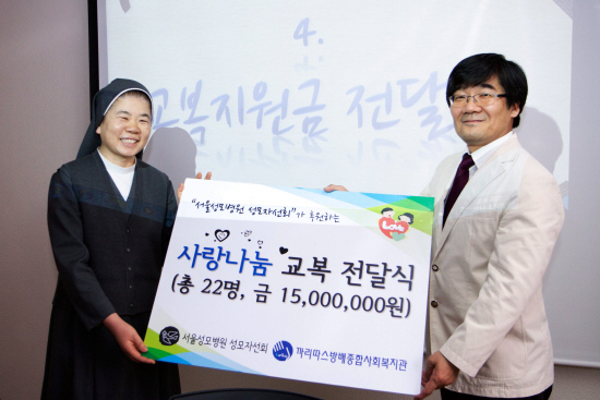 가톨릭대학교 서울성모병원 성모자선회 최환석 회장(가정의학과 교수)가 까리따스 종합방배사회복지관 김금례(요사팟) 관장 수녀에게 1500만원 상당의 교복 지원금을 전달하고 있다.