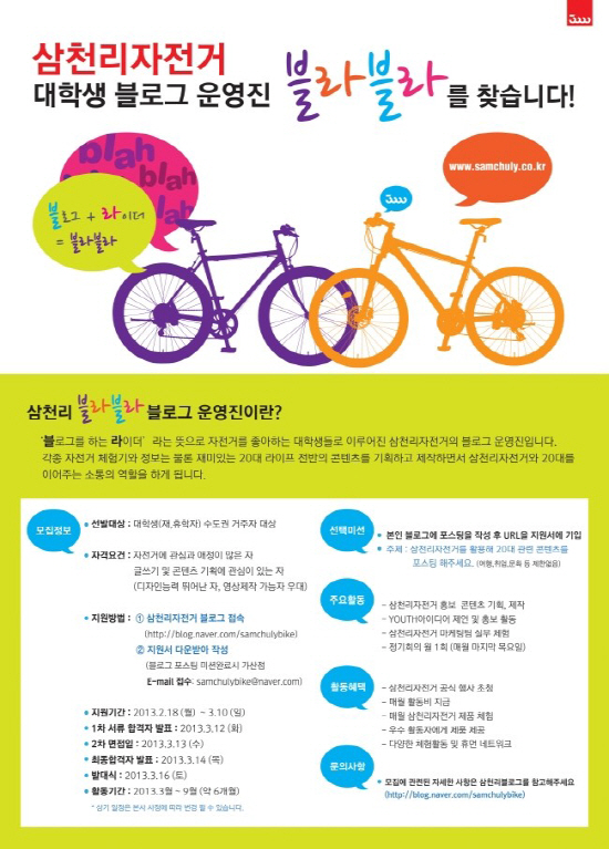 삼천리자전거(www.samchuly.co.kr)가 오는 10일까지 삼천리자전거와 20대 간 소통의 역할을 하게 될 대학생 블로그 운영진 '블라블라'를 모집한다.