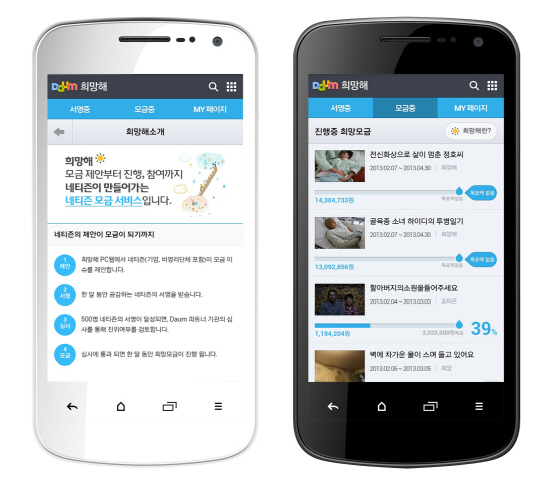 다음은 네티즌들이 편리하게 기부에 참여할 수 있는 환경을 구축하는 데 초점을 맞춰 '희망해' 모바일웹(m.hope.daum.net)을 기획했다. 이번에 오픈한 '희망해' 모바일웹을 통해 네티즌이 제안한 모금을 확인하고 공감 가는 이슈에 서명을 할 수 있으며, 다음 캐쉬, 휴대폰, 신용카드 등을 통해 원하는 금액만큼 기부 가능하다. 모금에 참여할 경우 모금 집행 내역을 메일로 받아볼 수도 있다.