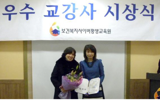 보건복지사이버평생교육원이 최근 사회복지과목 업무성취도가 높은 우수 교강사를 선정하여 시상했다. 가족복지론- 한영경 교수님, 노인복지론- 이인호 교수님이 우수교강사로 선정되어 소정의 감사금과 상패를 전달하였으며 이번 우수교강사 시상은 국가평생교육진흥원에서 권고하고 학습의 질을 재고하고자는 취지에서 시행됐다. 보건복지사이버평생교육원 이주희 부원장은 "교수님들의 노고에 감사드리며, 더욱 더 발전하는 보건복지사이버평생교육원이 되겠다"고 말했다.