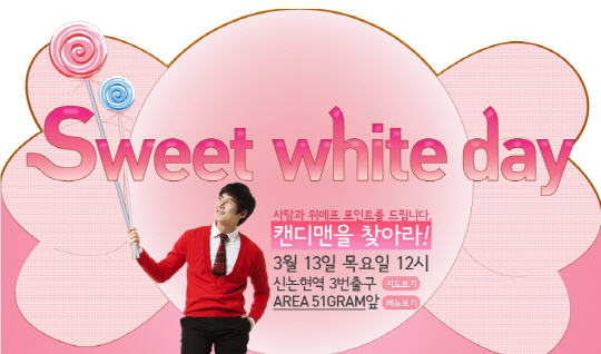 한편, 위메프는 화이트데이 전날인 3월 13일 12시 신논현역 일대에서 게릴라성 이벤트인 '캔디맨 이벤트'를 진행한다.