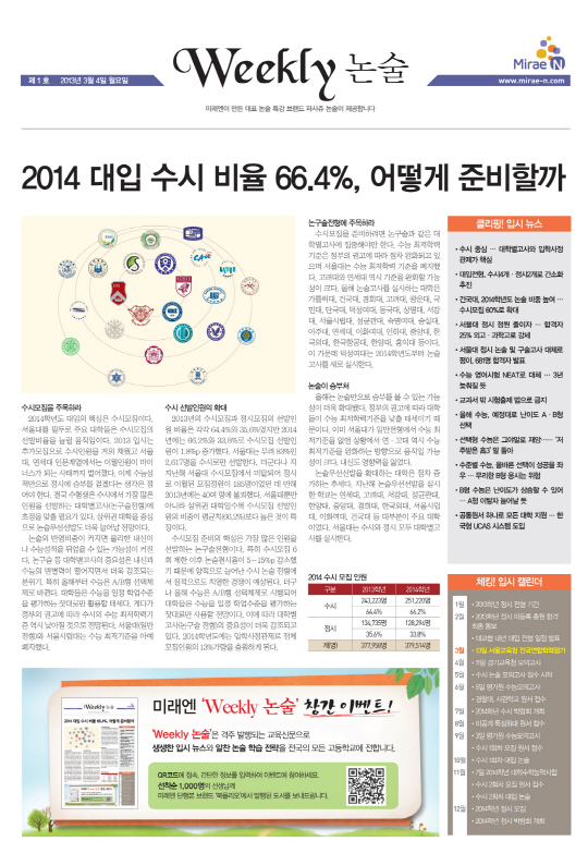 대학수학능력시험에서 갈수록 높아지고 있는 논술 비중에 맞춰 새롭게 선보이는 'Weekly 논술'은 입시 관련 교육뉴스를 비롯하여 주요 대학별 논술 기출문제 분석 및 입시 전략, 전국 유명 고등학교 인터뷰 등 다양하게 구성된다. 논술 학습 자료와 대학별 입시 전략은 미래엔의 방과후 특강 프로그램인 '파사쥬 논술'의 유명 강사진들이 직접 제공한다.