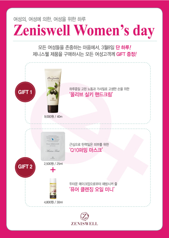 행사는 3월 8일 '세계 여성의 날' 단 하루 제니스웰 홈페이지(www.zeniswell.com)에서 구매한 고객을 대상으로 진행되며, 제품의 종류 또는 구매금액에 대한 조건 없이 구매만 하면, '제니스웰 올리브 실키 핸드크림' 또는 '제니스웰 Q10퍼핑 마스크 + 퓨어 클렌징 오일 미니'를 랜덤으로 제공한다. 제공되는 제품은 현재 제니스웰 홈페이지에서도 판매되는 정품으로 선물은 ID 당 1회 제공한다.