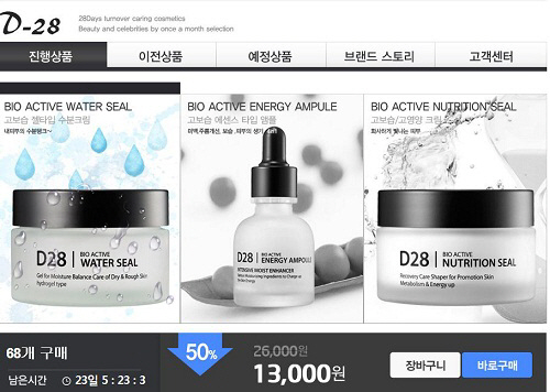 D28은 피부 재생주기 28일에 맞춘 신선한 천연화장품 전문 브랜드로써, 3월 새롭게 런칭된 바이오엑티브라인 3종(바이오엑티브 에너지앰플, 바이오엑티브 워터실, 바이오엑티브 뉴트리션실)을 50% 할인 판매하는 파격 행사를 실시 중이며, 많은 이미용 업계의 관심을 받고 있다.
