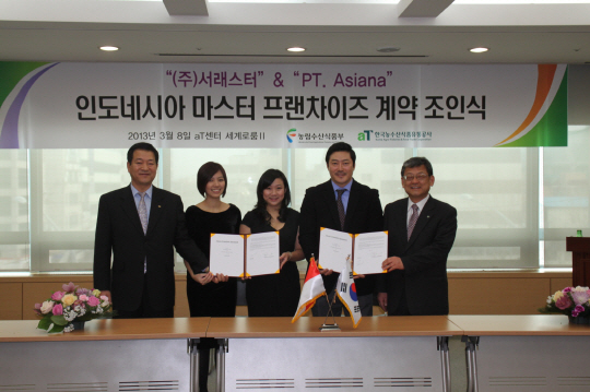 ㈜서래스터가 현지 법인 아시아나 인도네시아사와 마스터 프랜차이즈 계약을 성사하고 '인도네시아 마스터 프랜차이즈 계약 조인식'(사진)을 가졌다.