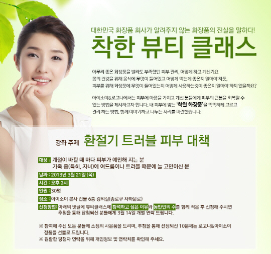 천연 기능성 화장품 브랜드 아이소이가 오는 3월 21일에 열리는 '착한 뷰티 클래스'에 참여할 환절기 피부 고민을 가진 참가자들을 모집한다.
