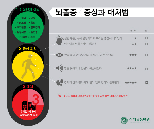 김용재 이대목동병원 뇌졸중센터장은 "뇌졸중이 발병하는 경우에는 대부분 전조 증상들을 보이는데 이를 가벼운 증상으로 여겨 지나치는 경우가 많다"며 "뇌졸중 위험인자가 있는 사람들은 '뇌졸중 단계별 대처표'를 통해 평소 뇌졸중 증상들을 숙지하고 증상이 나타나면 3시간 이내에 의료기관을 찾아 정확한 진단과 함께 적절한 치료를 받는 것이 중요하다"고 조언했다.