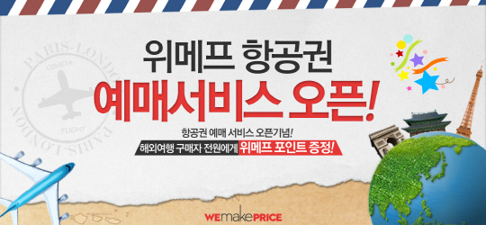 소셜커머스 위메프(대표 박은상·허민, www.wemakeprice.com)가 인터파크투어와 함께 소셜커머스 업계 최초로 항공권 예매 서비스를 런칭한다고 12일 밝혔다.