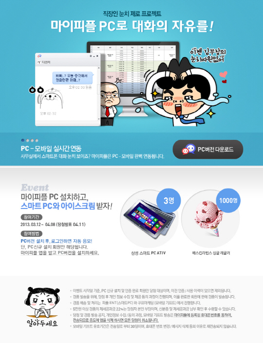 이번 '직장인 눈치 제로 프로젝트'는 더 많은 이용자들에게 자유로운 수다의 기회를 제공하고자 기획됐다. 내달 8일까지 마이피플 PC버전을 신규 설치한 회원이 대상이며, PC버전 설치 후 로그인하면 자동 응모된다. 기간 내 참여한 인원을 대상으로 추첨을 통해 삼성 스마트 PC 3대와 배스킨라빈스 아이스크림 기프티콘 1,000개 등 푸짐한 경품을 제공한다.
