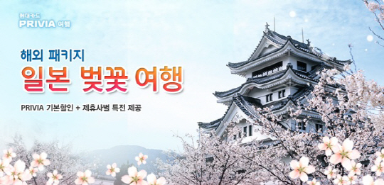 현대카드 프리비아(privia.hyundaicard.com)는 본격적인 벚꽃 개화 시즌을 앞두고 일본에서 가장 유명한 벚꽃 지역 상품만을 한데 모은 '일본 벚꽃 여행' 상품 기획전을 진행한다.