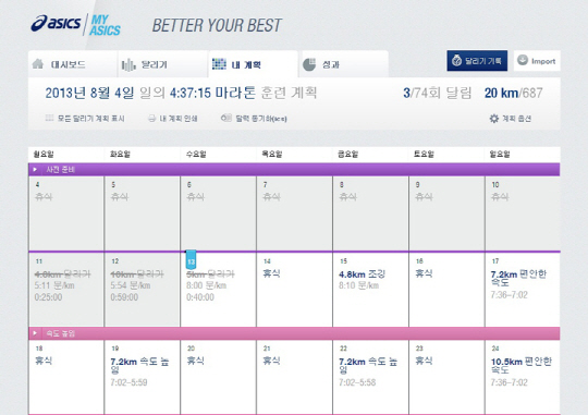 '마이 아식스'는 특히, 자신만의 목표를 설정, 달성하고자 하는 러너들에게 맞춤 플랜을 제공해 눈길을 끈다. 성별, 연령, 대회 날짜 및 완주 거리 등을 입력하면 캘린더 형식으로 일별 운동 계획을 볼 수 있다. 캘린더에는 운동 및 휴식 일자가 표시되며 운동 일자를 클릭했을 때 운동시간/거리, 페이스 조절법 등 맞춤형 정보를 확인할 수 있다.