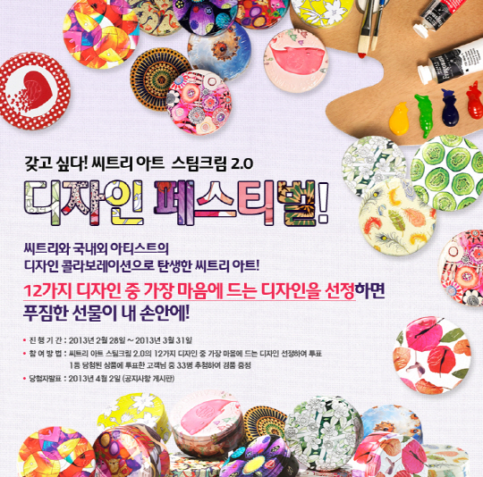 화장품 브랜드 씨트리(www.sociebeaute.com)가 '씨트리 아트 스팀크림 2.0' 국내 론칭을 기념해, 국내외 아티스트들과의 콜라보레이션을 통해 만든 12개의 패키지 중 최고의 디자인을 뽑는 '디자인 페스티벌' 이벤트를 31일까지 진행한다.