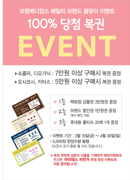 또한, 패밀리 브랜드인 '디오가닉'도 동일하게 7만원이상 제품 구매시 복권을 증정하고 '오시코시 비고시'와 '카터스'에서는 5만원 이상 제품을 구매하는 고객에게 스크래치 복권을 증정한다. 이 밖에도, 복권 뒷면에 이름과 연락처를 적어 매장직원에게 주면, 행사 기간 종료 후 추첨을 통해 10명에게 아이데스 자전거를 증정하는 이벤트도 함께 진행될 예정이다. 보령메디앙스 담당자는 "봄 나들이를 계획하고 있는 고객들이 빠짐없이 혜택을 누릴 수 있도록 하기 위해 100% 당첨의 스크래치 복권을 증정할 예정"이라며, "설레는 봄 맞이 준비와 함께 보령메디앙스가 준비한 실속 있는 혜택들을 놓치지 말고 이용하길 바란다"고 말했다. 이번 행사는 타티네 쇼콜라와 디오가닉, 오시코시 비고시, 카터스 전국 모든 매장에서 진행되며, 복권의 한정수량으로 인해 조기 마감될 수 있다. 송진현 기자 jhsong@sportschosun.com
