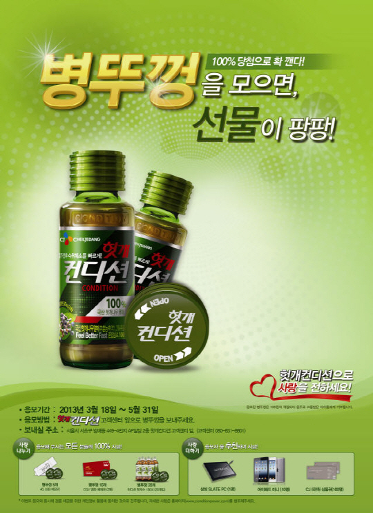 CJ제일제당의 헛개컨디션이 3월 18일부터 5월 31일까지 100% 당첨 병뚜껑 이벤트를 진행한다.