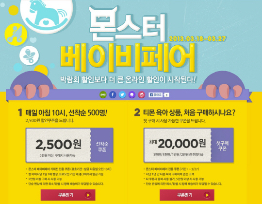 최근 통계청 발표에 따르면 작년 출산율이 11년 만에 최고치를 기록했다고 한다. 다양한 출산 장려정책만큼 육아에 드는 경제적 부담을 덜어주는 것만큼 반가운 일도 없을 터. 이러한 마음을 헤아려 국내 대표 소셜커머스 티몬(www.tmon.co.kr)가 예비·초보 엄마들의 귀가 번쩍 트일 만한 특별한 할인 이벤트를 준비했다.