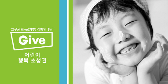 글로벌 No.1 소셜커머스 기업 그루폰(대표 김홍식, www.groupon.kr)이 주파크 웅진플레이도시점(운영사 (주)JHT) 및 아동복지전문기관 초록우산 어린이재단(회장 이제훈)과 함께 '그루폰 Give(기부) 캠페인'을 오는 25일(월)까지 진행한다.