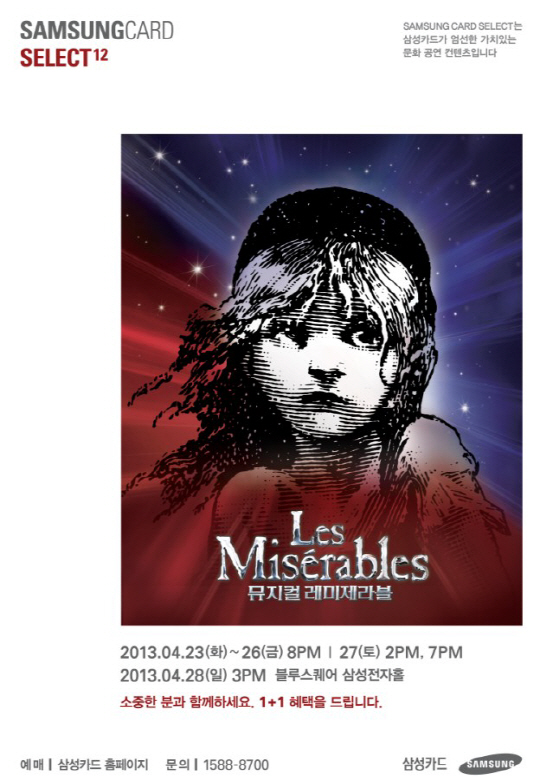 삼성카드(대표이사 사장 최치훈)는 '삼성카드 셀렉트'의 12번째 공연으로 '삼성카드 셀렉트12-뮤지컬 레미제라블'을 진행한다고 21일 밝혔다.