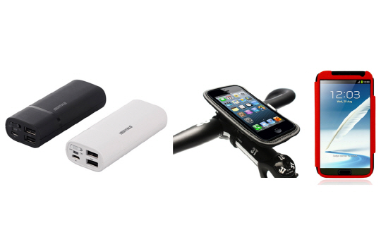 ◇버팔로 휴대용 모바일 충전기, 비엠웍스의 스마트폰용 자전거 거치대, 겟엠의 갤럭시노트2용 프라이버시 가죽케이스(왼쪽부터).