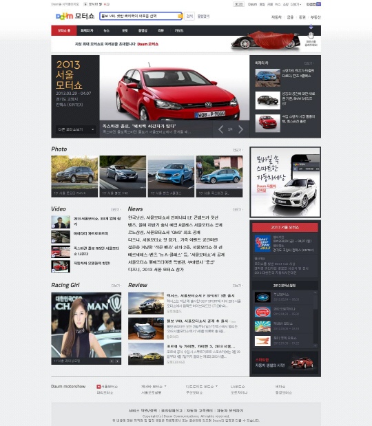 다음커뮤니케이션은 오는 29일부터 4월 7일까지 일산 킨텍스에서 개최되는 '2013 서울모터쇼'를 공식 후원하고, 이용자들이 보다 빠르고 쉽게 모터쇼 정보를 얻을 수 있도록 PC와 모바일에 특집페이지를 동시 오픈했다.