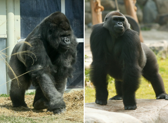 서울대공원은 국내 유일의 로랜드고릴라 '고리나'(오른쪽)의 대를 잇기 위해 지난해 12월 23일 서울동물원에 들여온 수컷 고릴라 '우지지'를 25일 처음으로 공개한다. 영국 포트림동물원에서 브리딩론으로 영구 임대한 우지지는 고리나와 얼굴을 익힌 후 합방할 예정이다. 2013.3.24 << 서울대공원 제공 >> photo@yna.co.kr (끝)
