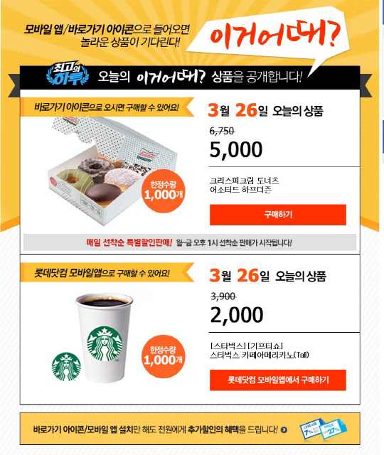 26일 롯데닷컴 모바일 어플리케이션에서는 '스타벅스 아메리카노(tall size 3,900원)'를 2,000원에, PC 바탕화면 상에 설치된 바로가기 아이콘을 통해 접속하면 '크리스피크림 도너츠 어소티즈 하프더즌(6,750원)'을 5,000원에 선보인다. 해당 상품은 한정 수량으로 판매되며, 매일 변경될 예정이다.